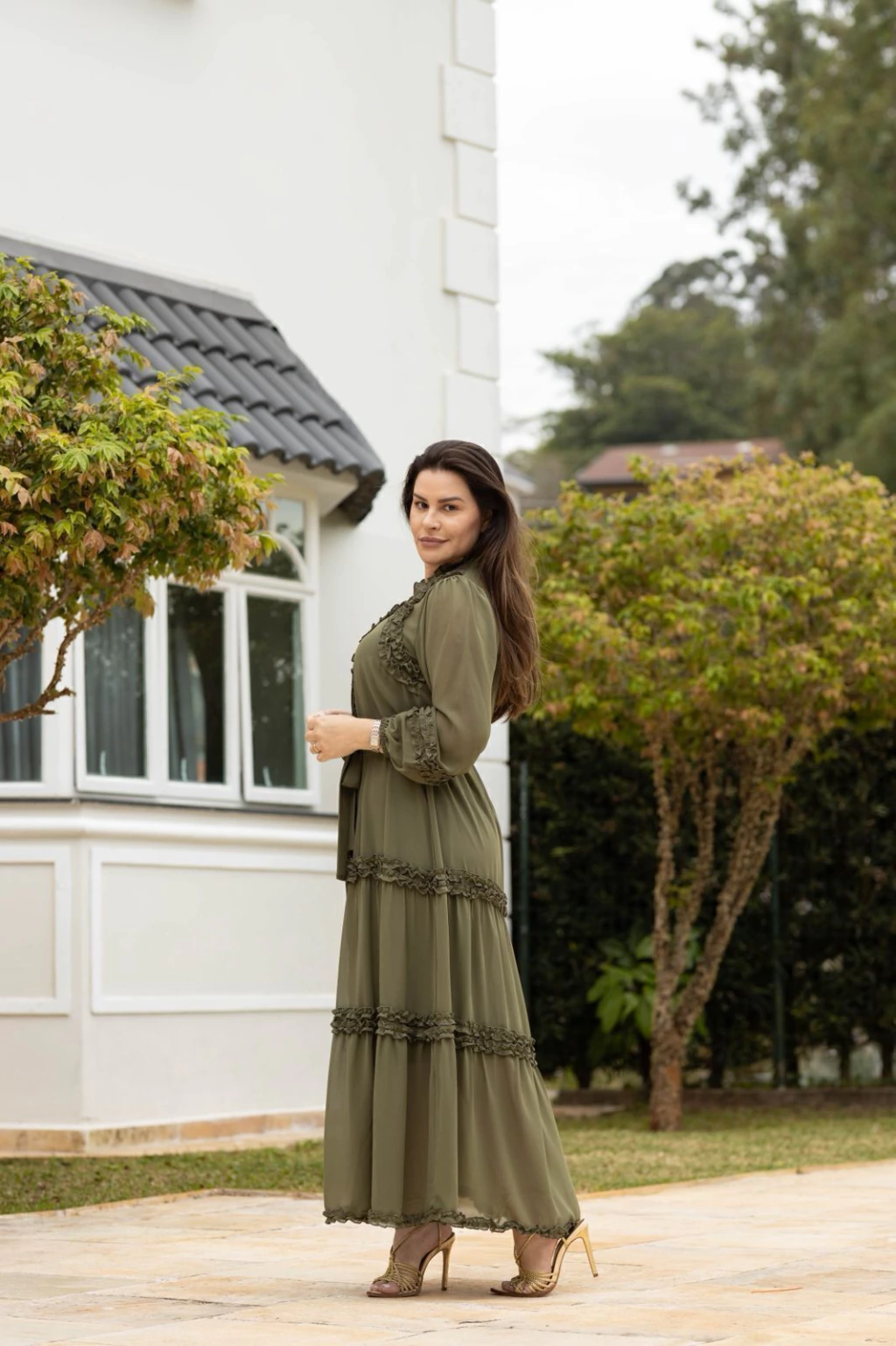 Elegante e atemporal, o vestido longo em chiffon transmite leveza e feminilidade. Possui modelagem fluida, gola padre e mangas longas com punhos franzidos, além de delicados babados que contornam o corpo com sofisticação. Acompanha faixa para amarração na cintura e forro de alça para maior conforto.